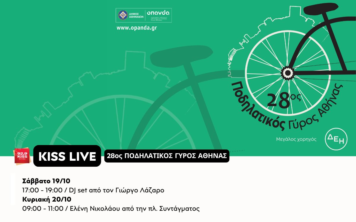 Ο 92.9 Kiss θα βρίσκεται στον 28ο Ποδηλατικό Γύρο της Αθήνας που διοργανώνει ο Δήμος Αθηναίων μέσω του Οργανισμού Πολιτισμού, Αθλητισμού & Νεολαίας Δήμου Αθηναίων (ΟΠΑΝΔΑ) την Κυριακή 20 Οκτωβρίου!