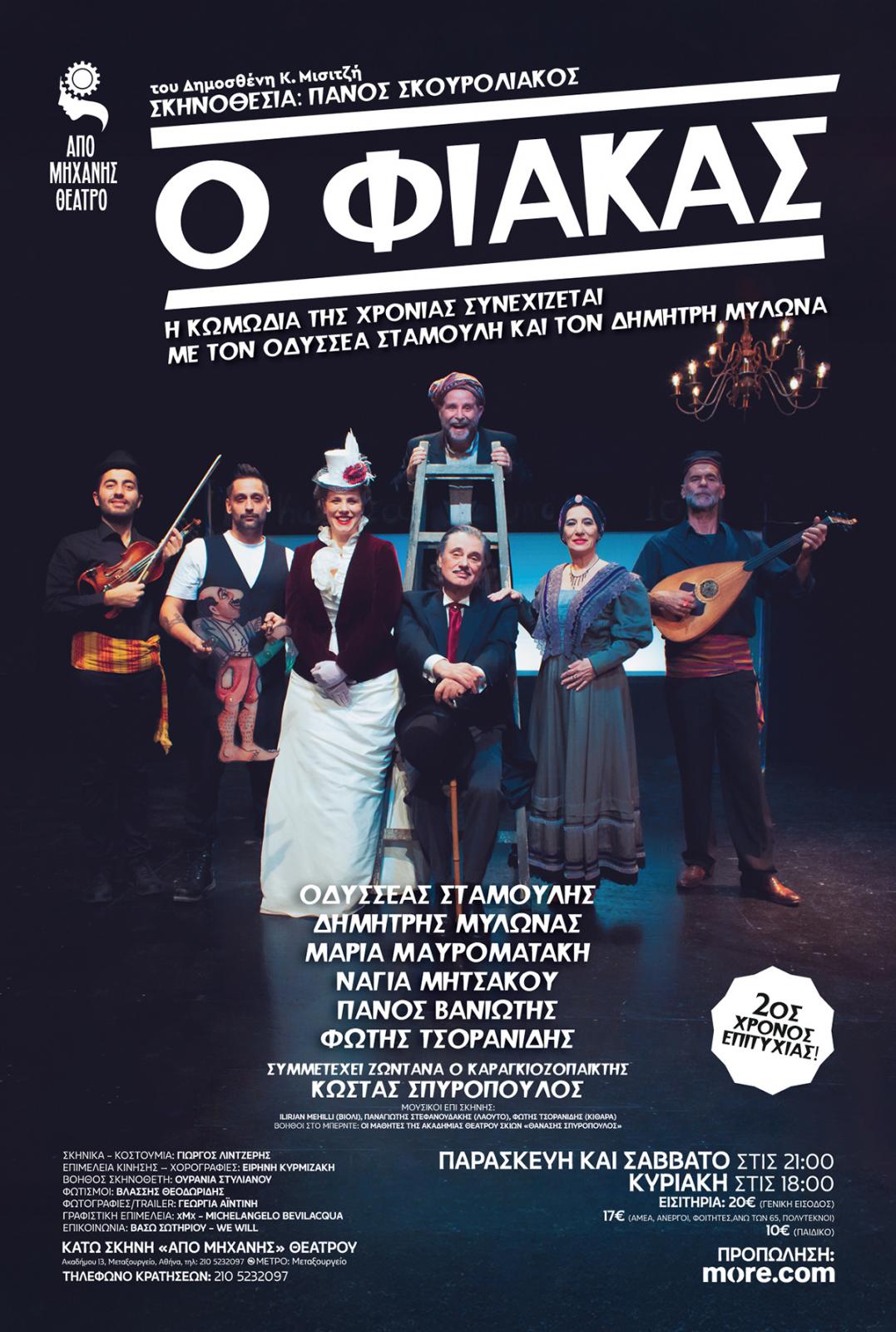 «Ο Φιάκας» του Δημοσθένη Κ. Μισιτζή σε σκηνοθεσία Πάνου Σκουρολιάκου που μέχρι στιγμής την έχουν παρακολουθήσει πάνω από 10.000 θεατές, συνεχίζεται στο «Από Μηχανής» Θέατρο με τον Οδυσσέα Σταμούλη στο ρόλο του αξιαγάπητου απατεώνα Φιάκα και τον Δημήτρη Μυλωνά στο ρόλο του παμπόνηρου υπηρέτη του, Γιάννη.