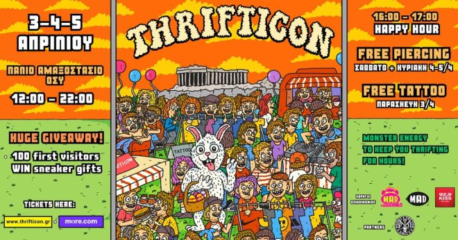 Το THRIFTICON θα ανοίξει τις πόρτες του τη Παρασκευή 3 Απριλίου στις 12:00, με ένα μεγάλο GIVEAWAY πέρα από κάθε φαντασία που θα ξετρελάνει τον κάθε sneakerhead, καθώς οι 100 πρώτοι επισκέπτες του event θα κληρωθούν αυτόματα κατά την είσοδο στο χώρο της εκδήλωσης για 100 μοναδικά δώρα, με τα μεγάλα δώρα να είναι: