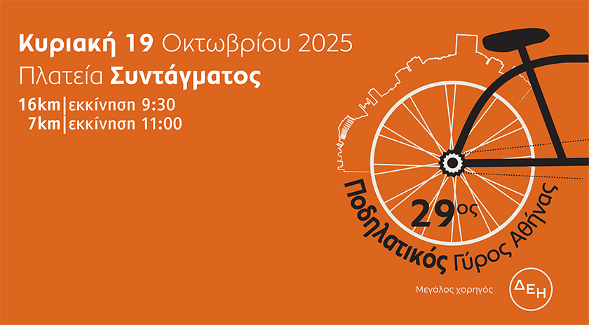 Το κορυφαίο αθλητικό γεγονός του Δήμου Αθηναίων για το ποδήλατο, ο 29ος Ποδηλατικός Γύρος της Αθήνας που πραγματοποιείται με την ενέργεια της ΔΕΗ, επιστρέφει την Κυριακή 19 Οκτωβρίου 2025, με αφετηρία και τερματισμό την πλατεία Συντάγματος!
